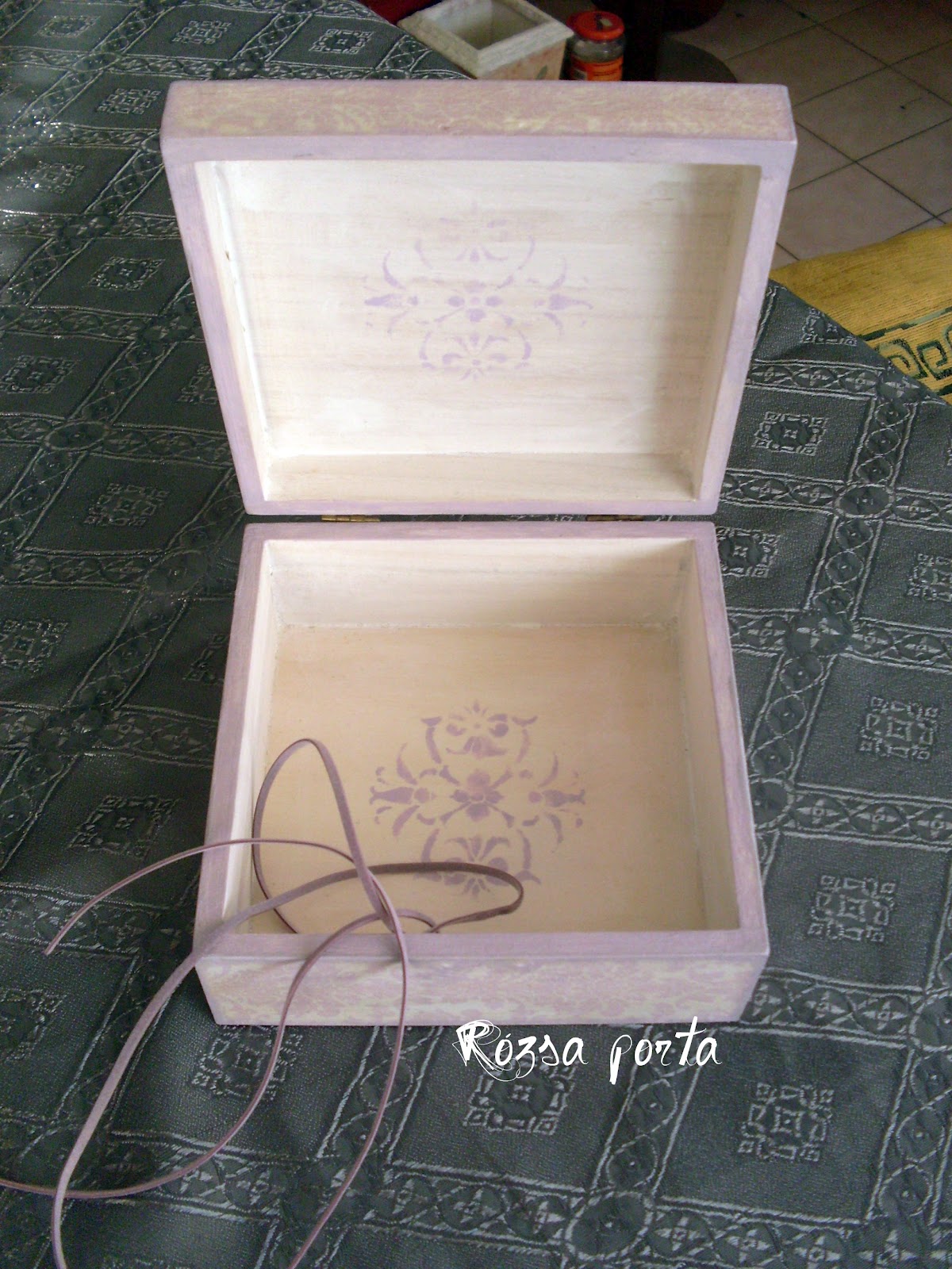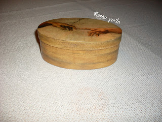 Saját nyomattal dolgoztam ezen a dobozon is, amit nagyon szerettem,sokáig dédelgettem, míg megváltam tőle. Sajnos ennek ellenére nem készült róla kép csak akkor, amikor még nem volt felszerelve rá a csat. A gyári nem tetszett, az igazi váratott magára, így sokáig enélkül maradt. Végül pedig az újrafotózásból kimaradt. (Még jó, hogy akkor lefényképeztem, így legalább ez megvan, sajnos elég sok munkámról semmilyen fotóm nincsen.)
