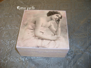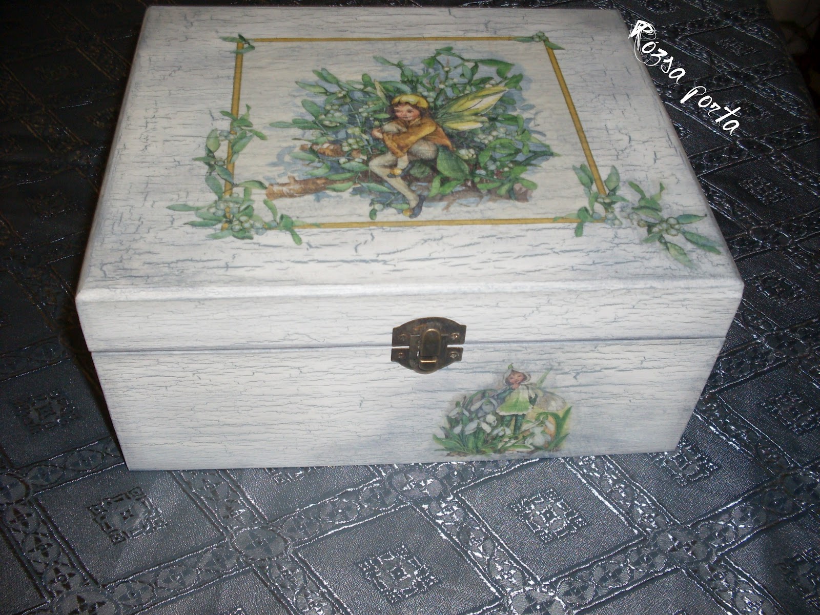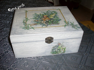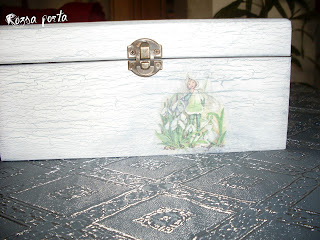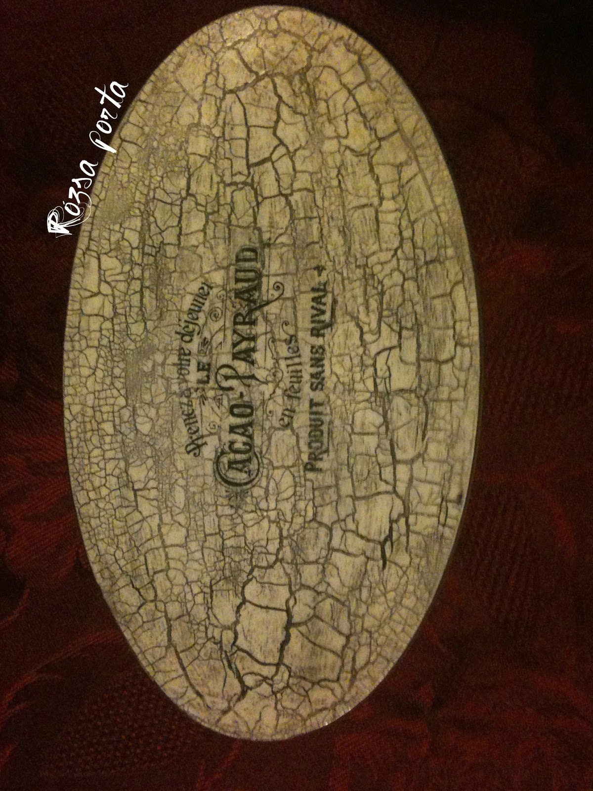 A háncsdoboz, amire dolgoztam noha nem a legkisebb, de nem is hatalmas méretű, mégis elég sok technikát bevetettem nála. Van ezen kérem szépen minden, többféle repesztés, stuktúr- és repedőpaszta, antikoló, saját nyomat, szalvéta, egy kis kézi festegetés... és az alap előkészítését mindehhez még fel sem soroltam.