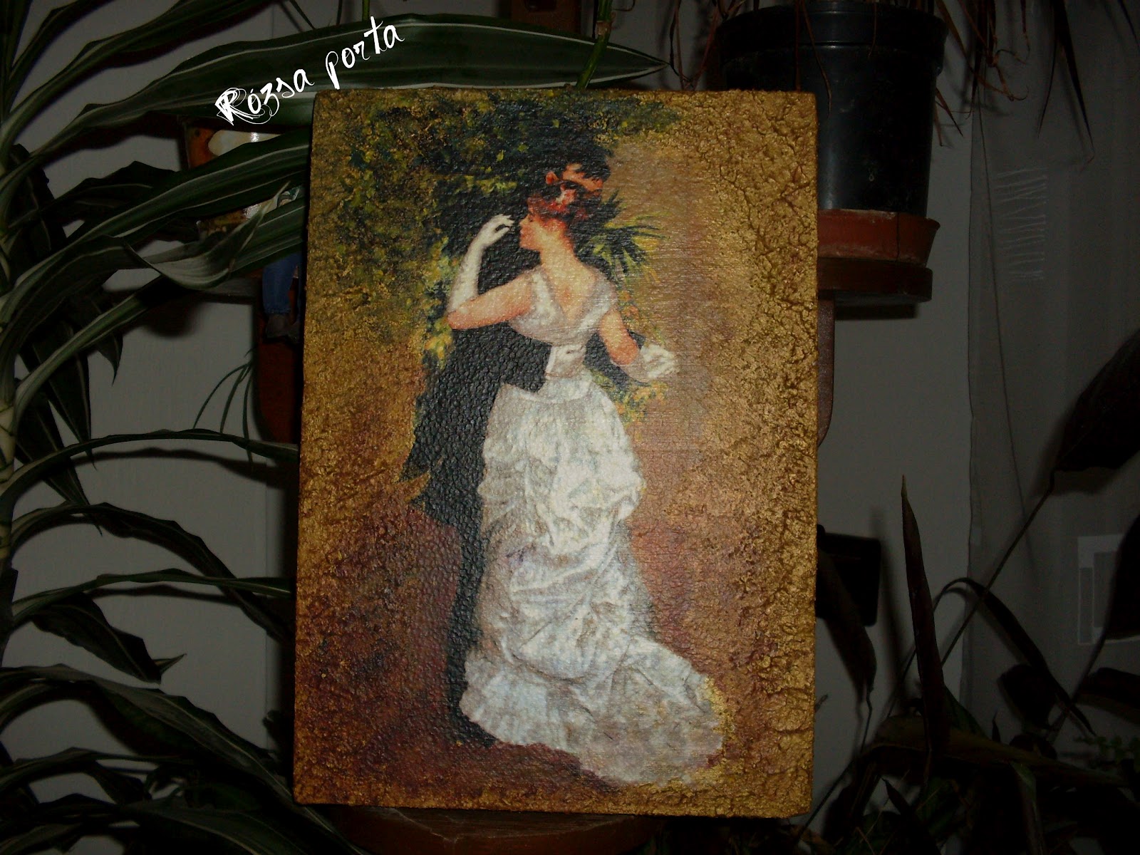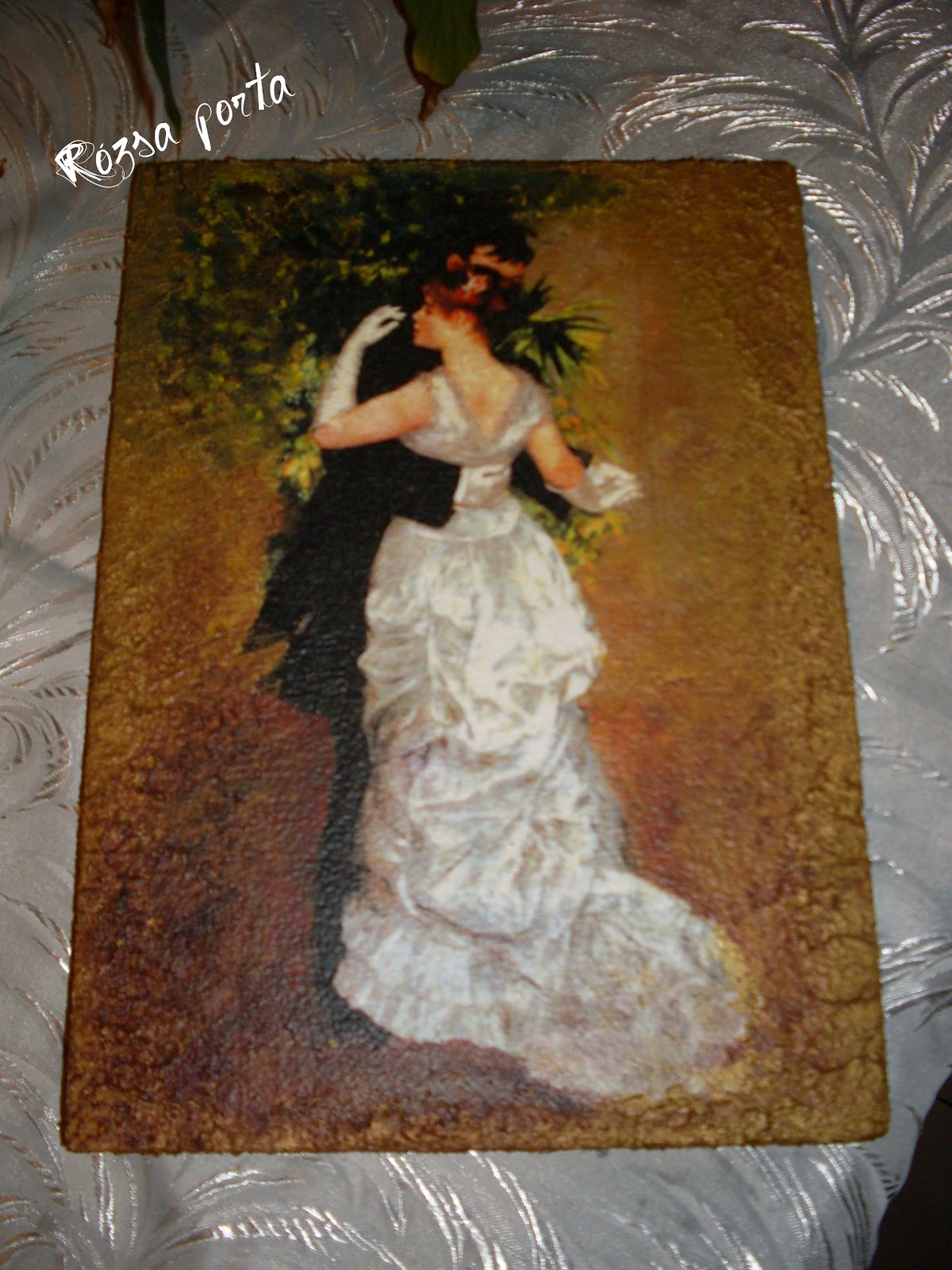 Ezen a képen szalvétát használtam, a képet körben egy viszonylag széles sávban nekem kellett folytatnom. Az úr frakkjának háromszögletű "farka" már nem volt a képen, a hölgy ruhájából az uszályos rész alja is hiányzott, s a kép tetején a festő (Renoir) által megfestett "zöldövezetet" is folytatni kellett.