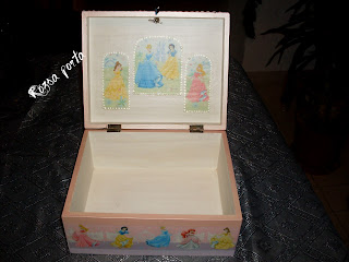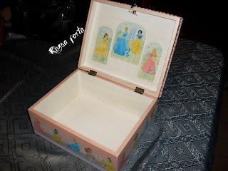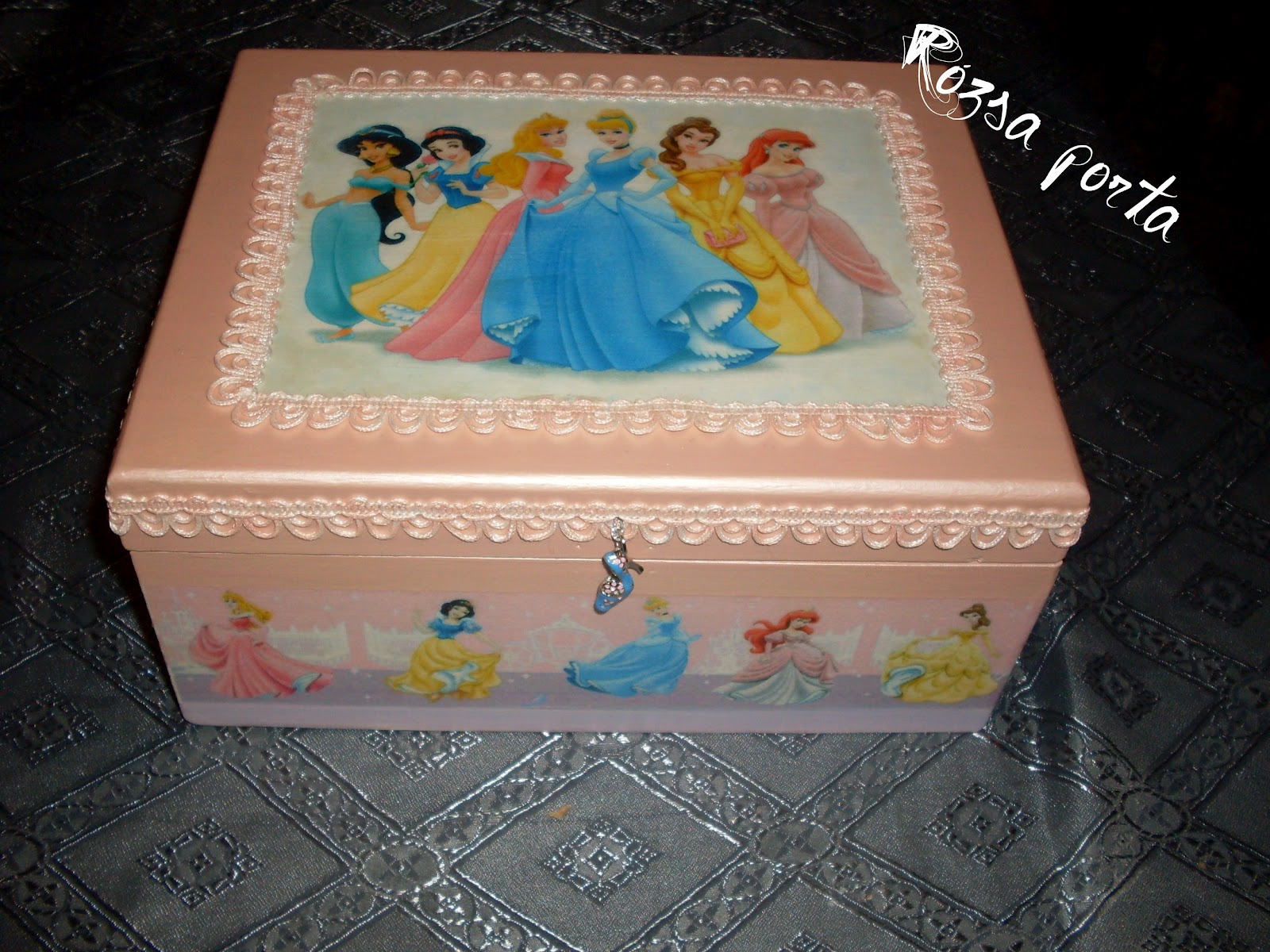 Egy kolléganőm kislányának készült ez a doboz, hajszobrászati kellékeinek tárolására, s kérésre a dobozok között fellelhető legnagyobb méretben. Sokáig keresgettem a gyári doboz-csat helyett valami eredetibbet, érdemes volt emiatt kicsit félretenni, sikerült találnom egy apró kövecskékkel kirakott kék ezüsttopánt, szerintem ez sokkal helyesebb rajta (eredetileg kulcstartó volt, három ilyen kis topán fityegett rajta).