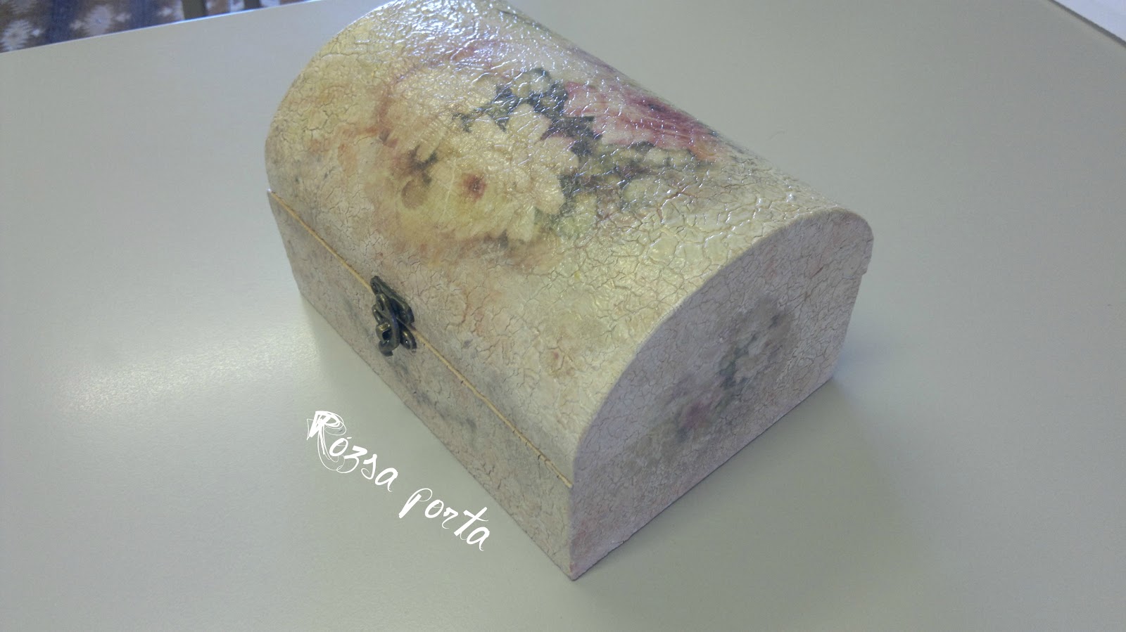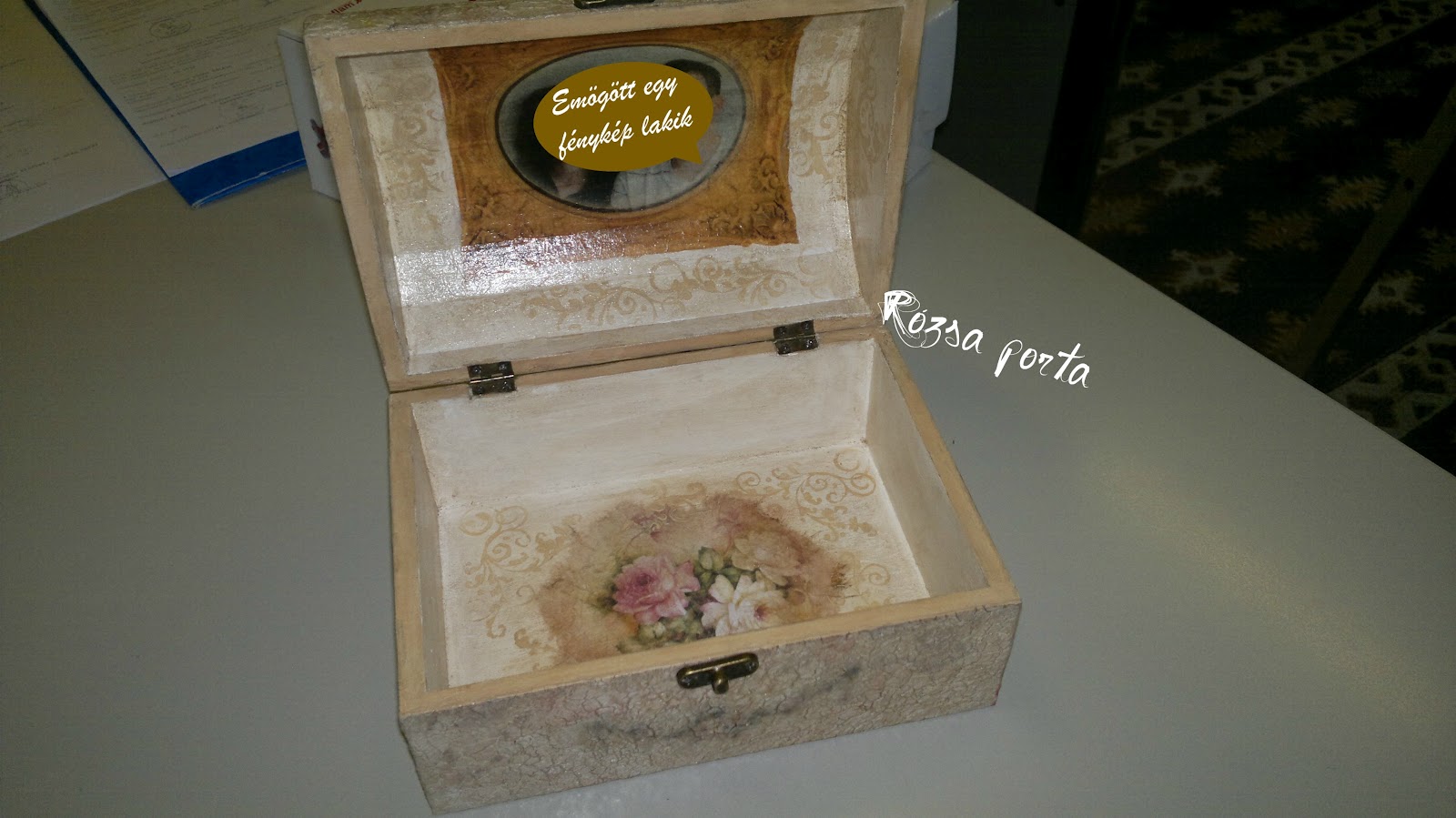 Esküvőre készült, kicsit meg is volt szabva ám az irány, ami úgy szólt, hogy legyen rózsás, antikolt, repesztett, ládaszerű formájú, s legyen rajta a fiatalok képe, s mindehhez - gondoltam ezt már csak úgy magamtól - fiataloknak készül, tehát úgy is nézzen ki.
