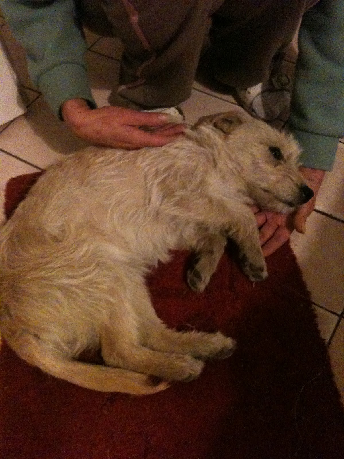 Aztán jöttek a problémák. Hova tegyük? Alex, a skót juhász mellé? És ha ebből baj lesz? Maradt a garázs, estétől délelőttig öt napon át. Szegénynek nem is volt igénye többre. Étel, víz, meleg pléd, pihenés, napközben Máté (szerencsére ő úgy jár suliba, hogy délelőtt itthon van), délutántól mindannyiunk társasága. Másnap fürdetés, újabb 5 kullancs, s némi sokk nekem: Úristen, itt bolha is van! De ezen is túl vagyunk.