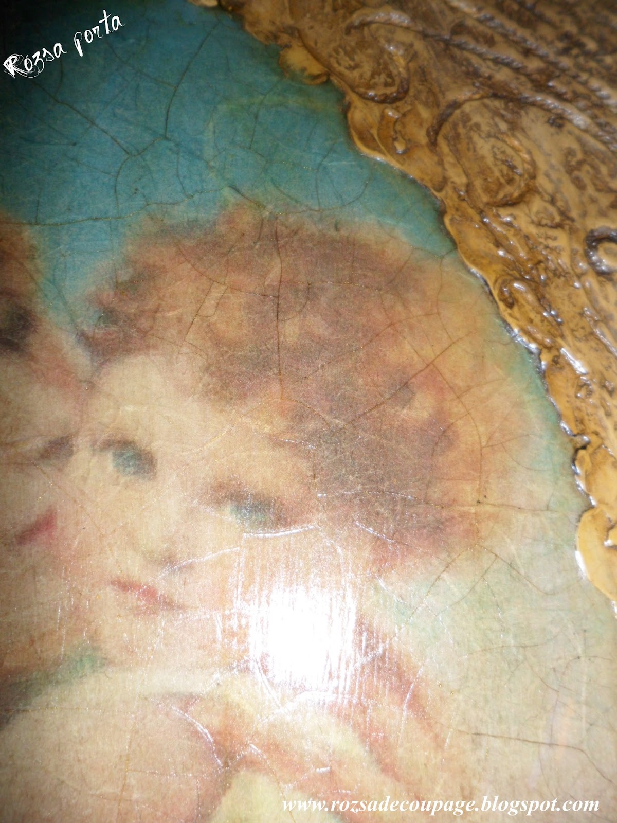Azért egy kis decoupage-os technikai dolgot meg kell jegyezzek. Szeretem a rizspapírt, amíg a hagyományos decoupage-papírokkal nem tanultam meg bánni a saját nyomataim mellett talán ezeket kedveltem a leginkább, de a rizspapírok rostjai bizony nem mindig tetszenek.Amikor éppen egy arcba esik ennyi rostszál, az - nekem legalábbis - zavaró. A papírt rendeltem, valószínűleg ha helyszínen vásárolok kicsit válogatósabb vagyok, de ez került hozzám. Egy decoupage-papírral az ember lányának nincsenek ilyen problémái, persze az is igaz, hogy azzal viszont ezt a technikát nem lehet megcsinálni. Azért a valóságban nem ennyire zavaró a dolog, valahogy a fotón sokkal markánsabbnak tűnik mindez.