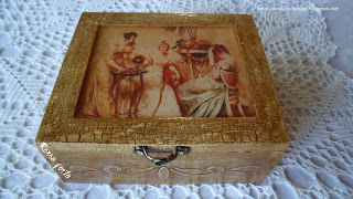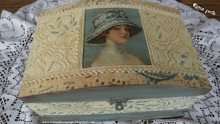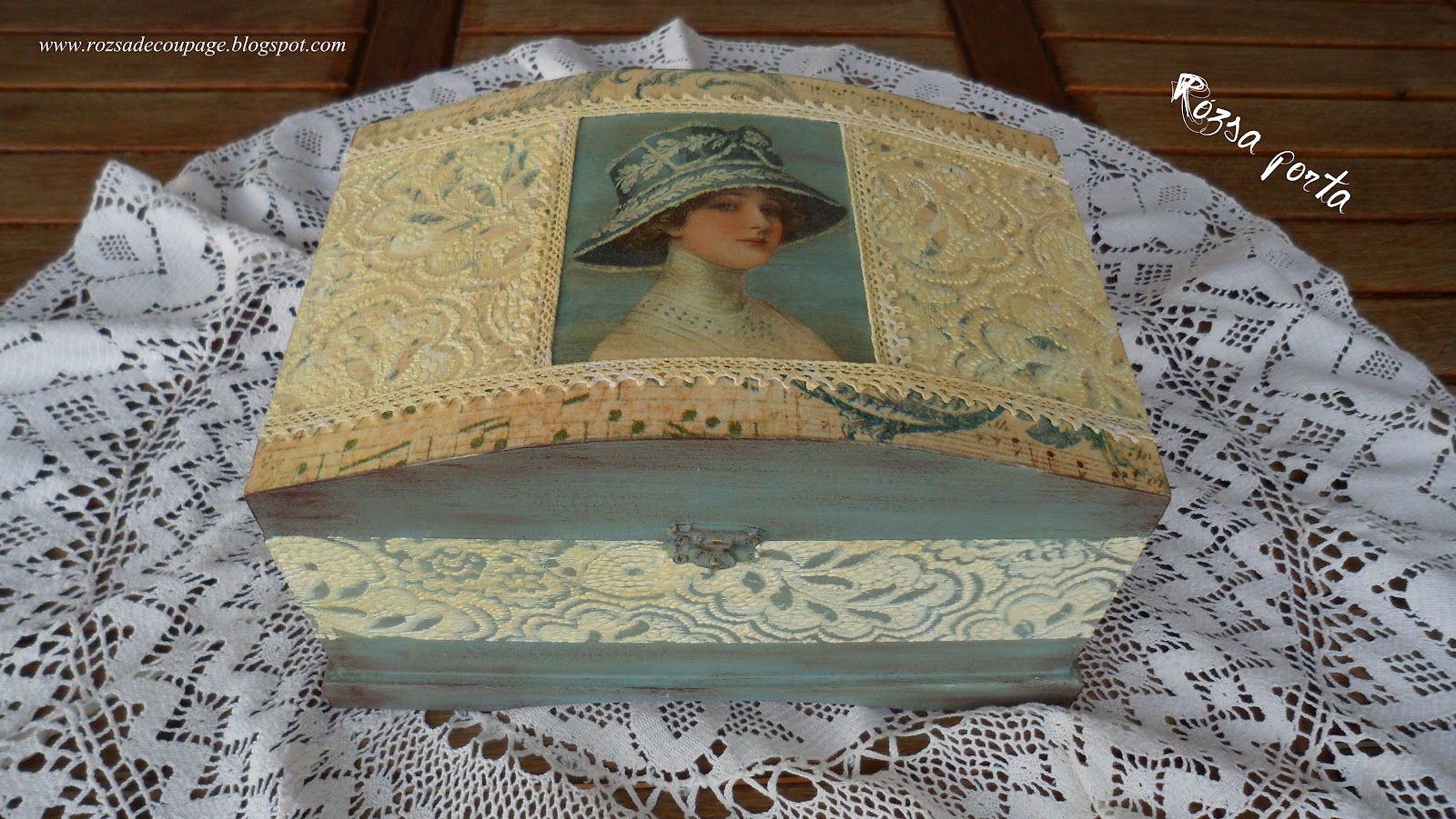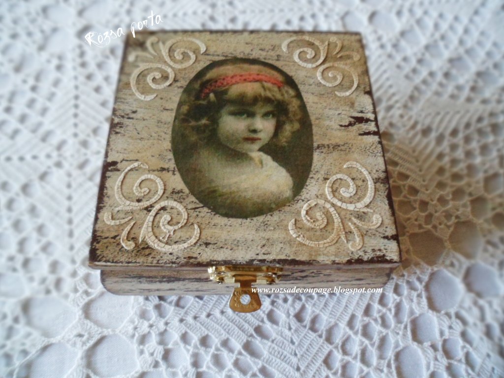 Készült egy dobozka, amolyan nosztalgia-hangulatban, koptatott technikával, egy édes kislány arcával. Imádom ezeket a régi fotókat, megszámlálhatatlan mennyiséget leszedtem magamnak, ha rábukkanok egyre, ami még nincs meg, nem bírom nem elmenteni! Ha egy új blogot kezdenék, amire a begyűjtött képeimet tenném fel, hát azzal is ellennék hosszú-hosszú ideig. Talán ez azért van, mert amikor még csak "elvi síkon" foglalkoztam a decoupage-al, akkor laptoppal az ölemben hosszú-hosszú estéket-éjszakákat töltöttem azzal, hogy az interneten barangoltam és "szívtam" magamba a decoupage-t, leginkább elkészült tárgyakra bukkantam,s ennek kapcsán időnként el-eltévelyedtem, s bizony akkoriban nem kevés festményt, vintage-hangulatú képet, s általában mindenféle nekem tetsző képet elmentettem. Szóval ez a bájos kislány is ebből a forrásból való.