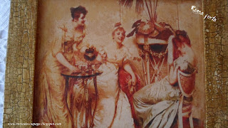 Az egyik ilyen darab ez a teásdoboz, tényleg kb. egy órás munkafázisra várt, hogy kész legyen hónapok óta. Egy négyrekeszes doboz volt az alap, aminek üveg-betét a teteje, erre dolgoztam, s a végén ún. folyékony üveggel, üveglakkal, nem is tudom minek kell hívni "öntöttem be" a kép tetejét. /Elmentem, megnéztem , Pentart márkájú, A-B, tehát két komponensű cucc, üveglakk névre hallgat. Nagyon szép hatása van, olyan a végeredmény, mint egy fényes csempe és nagyon ellenálló száradás után./ Persze a kép, amit használtam nem passzolt az üveglapra, kisebb volt, ezért jobbról és balról a szélén kicsit hozzá kellett festeni, nem sokat, de azért kellett egy kis ecset-játék.
