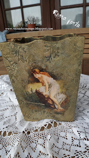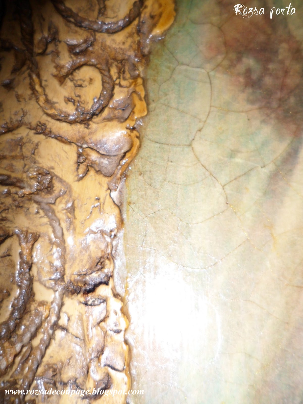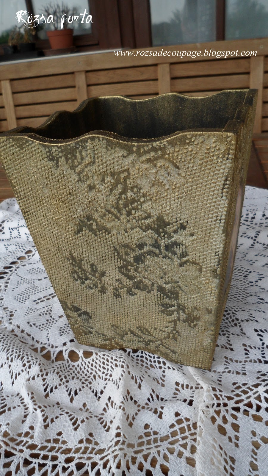 Muszáj leírnom, a papír Sólyom Gabitól van. Több okból, egyrészt, mert arról írtam már korábban blogban, hogy mennyire jó, hogy az ő decoupage-papírjai mindamellett, hogy nagyon szépek, még nem amolyan tucat-termékek, ezekkel még nem találkozunk lépten-nyomon, ha a neten szörfözünk, s decoupage-alkotásokat sasolunk, másrészt sajnos azért, mert Gabi fog ugyan papírokat tervezni, de azokat már nem saját maga, hanem - bocsi, most nem írhatom ide melyik - egy neves cég fogja forgalmazni, s valamiért én már most hiányolom emiatt Gabi papírtervezési teljes szabadságát. Bár ne legyen igazam! A harmadik ok, hogy leírhassam, hátha valakinek "jól jön" az információ, Gabi a blogján, pont emiatt a váltás miatt igen nagy árleszállítással árusítja ki raktáron lévő készletét! Ígérem, a jövőben nem írom, ha bármi alkotásom képanyaga Tőle származik - pedig lesz még ilyen szerintem bőven, én bizony bespájzoltam Sólyom Gabi-s papírokból rendesen :) - , de úgy érzem most az egyszer, mivel a forrás megszűnni készül, s ráadásul még jó nagy akció is van vásárlás terén "közérdektől vezérelve" megteszem.
