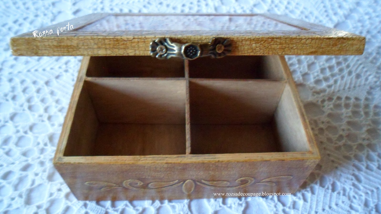 Az egyik ilyen darab ez a teásdoboz, tényleg kb. egy órás munkafázisra várt, hogy kész legyen hónapok óta. Egy négyrekeszes doboz volt az alap, aminek üveg-betét a teteje, erre dolgoztam, s a végén ún. folyékony üveggel, üveglakkal, nem is tudom minek kell hívni "öntöttem be" a kép tetejét. /Elmentem, megnéztem , Pentart márkájú, A-B, tehát két komponensű cucc, üveglakk névre hallgat. Nagyon szép hatása van, olyan a végeredmény, mint egy fényes csempe és nagyon ellenálló száradás után./   Persze a kép, amit használtam nem passzolt az üveglapra, kisebb volt, ezért jobbról és balról a szélén kicsit hozzá kellett festeni, nem sokat, de azért kellett egy kis ecset-játék.