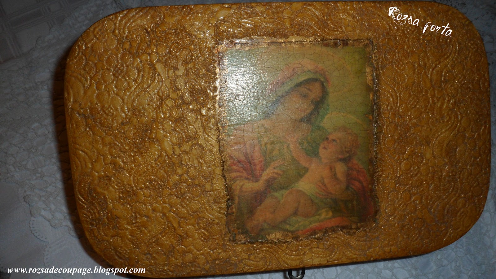 Kisebbik fiam barátja volt a "megrendelő", édesanyjának ajándékozta karácsonykor. A témát ő kérte. Kiválasztottam egy csokorra való nekem igazán tetszőt, s abból kellett aztán neki tovább szűkítve a "képtárat" megjelölni kettőt. Csak egyhez ragaszkodott, de ahhoz nagyon, hatalmas lelkesedéssel csapott le az egyikre - ezt használtam a doboz tetején - mondván, hogy édesanyja pont egy olyan nyakláncot hord, amin ez a kép van. Szégyenlem, de most így utólag rákeresve sem tudom kideríteni a festmény alkotóját. Ha valaki tudja, kérem írja meg, mert én ha festményekkel dolgozom, bizony szeretem tudni, hogy kitől származik. A doboz belsejébe az olasz reneszánsz művész, Raffaello (ismertebb és egyszerűbb nevén Raphael) festményét használtam. Nagyon szeretem a műveit, az általa ábrázolt Madonnákon valami teljesen egyedi emberi érzelmek "sütnek át", s olyan szépen bánt a színekkel, mélységekkel, fényekkel, árnyékokkal, amiktől képei egyedülállóan élethűek, csodálni valóak, mérhetetlen nyugalmat, melegséget árasztanak. Mindössze 37 évet élt, de e rövid életébe hihetetlenül sok csodás alkotás belefért.
