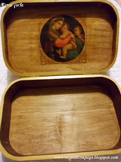 Kisebbik fiam barátja volt a "megrendelő", édesanyjának ajándékozta karácsonykor. A témát ő kérte. Kiválasztottam egy csokorra való nekem igazán tetszőt, s abból kellett aztán neki tovább szűkítve a "képtárat" megjelölni kettőt. Csak egyhez ragaszkodott, de ahhoz nagyon, hatalmas lelkesedéssel csapott le az egyikre - ezt használtam a doboz tetején - mondván, hogy édesanyja pont egy olyan nyakláncot hord, amin ez a kép van. Szégyenlem, de most így utólag rákeresve sem tudom kideríteni a festmény alkotóját. Ha valaki tudja, kérem írja meg, mert én ha festményekkel dolgozom, bizony szeretem tudni, hogy kitől származik. A doboz belsejébe az olasz reneszánsz művész, Raffaello (ismertebb és egyszerűbb nevén Raphael) festményét használtam. Nagyon szeretem a műveit, az általa ábrázolt Madonnákon valami teljesen egyedi emberi érzelmek "sütnek át", s olyan szépen bánt a színekkel, mélységekkel, fényekkel, árnyékokkal, amiktől képei egyedülállóan élethűek, csodálni valóak, mérhetetlen nyugalmat, melegséget árasztanak. Mindössze 37 évet élt, de e rövid életébe hihetetlenül sok csodás alkotás belefért.
