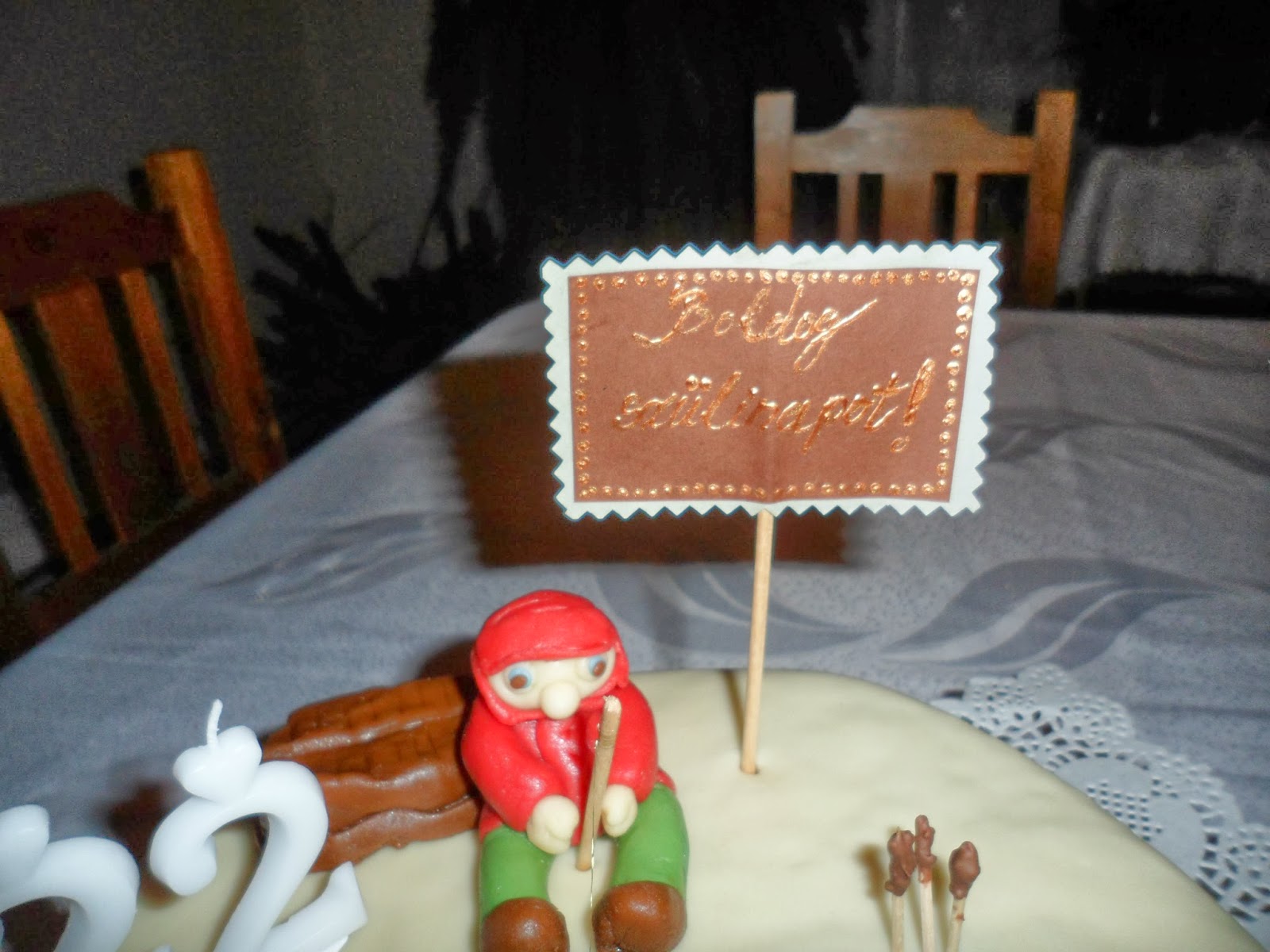 Mivel mint írtam horgász-ágyat kért ajándékként, először arra gondoltam, hogy megpróbálom a fekvő horgász pózt marcipánból, de mivel az ágy kekizöldjét sem időm, sem ötletem nem volt, hogy hogyan is "keverjem ki" marcipánból, így nem fektettem le, hanem készült egy ladik, annak dőlve üldögél a kedves. A tó köré már nem maradt időm szöszmötölni további díszeket (pl. kavicsok, stb.), kicsit emiatt puritán lett.