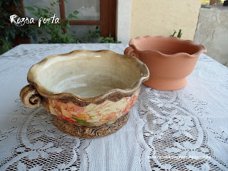 ... hát nekem bizony ez volt a "mézesmadzag", vagyis ez volt az a tárgy, ami miatt nem bírtam leküzdeni magamban azt a gondolatot, hogy idén kihagyom ezt a hétvégét. Mert ez a mintadarab annyira csábító volt, hogy emiatt akartam nagyon-nagyon ott lenni.  Hiába próbáltam, nem tudtam kitalálni, hogy az a domború minta ugyan bizony hogyan kerekedett a tál alján és a felső peremén? Az eredeti tárgyon aranyfüst is van, de én (gondolom ez már kiderült azoknak, akik olvassák, nézegetik ezt a globot) nem vagyok egy "aranyos" lány, így azt kihagytam, helyette repesztőlakkal fejeztem be itthon, hogy olyan kis" nagymama-öröksége"- kerekedjen belőle. A háttérben láthatjátok magát az alapot. (Volt néhány plusz darab, így szert tehettem egyre, egymás mellett látva valljuk be, igencsak átalakult, ugye?)