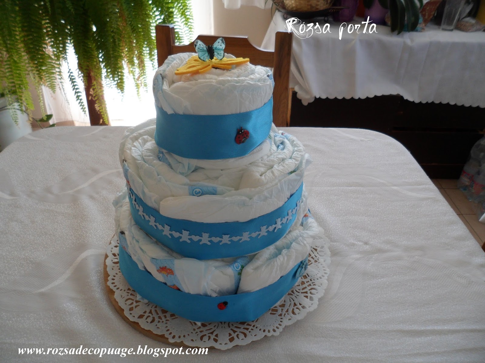 Hogy azért a kis ünnepelt is kapjon valami olyan tortát, aminek hasznát veszi, készült egy pelenkatorta. Na erre aztán végképp szinte alig maradt időm, ez már a keresztelő napján, tényleg az utolsó pillanatban állt össze, kb. fél óra alatt, gyorsan segítségül hívva a férjem enyémnél valljuk be kicsit nagyobb tenyereit, mert négy tenyérrel sokkal haladósabb volt az összeállítás. Egy jópofa ajándék ez pici babáknak, amihez nem kell más, csak pelenka, szalagok, s bármilyen apró kis figurák, amik a kezedbe akadnak, vagy amelyekbe egy-egy lelőhelyen beleszeretsz. A torta váza egy lefogyott alufólia-guriga papírhengere, ez van felállítva, s ez köré kell körbe pakolgatni a pelust, három emelet magasságban, emeletenként szalaggal átkötve. Ennyi.