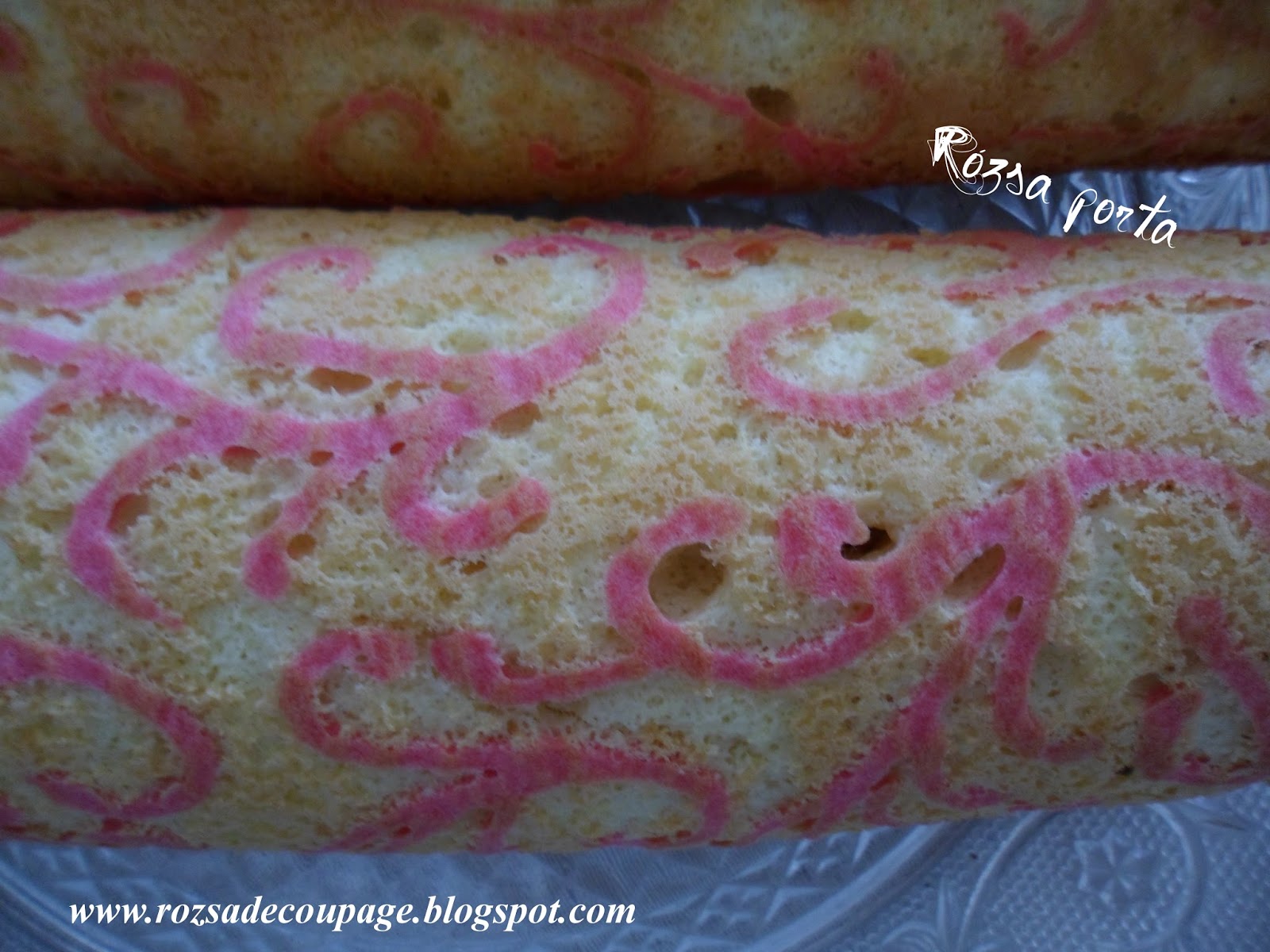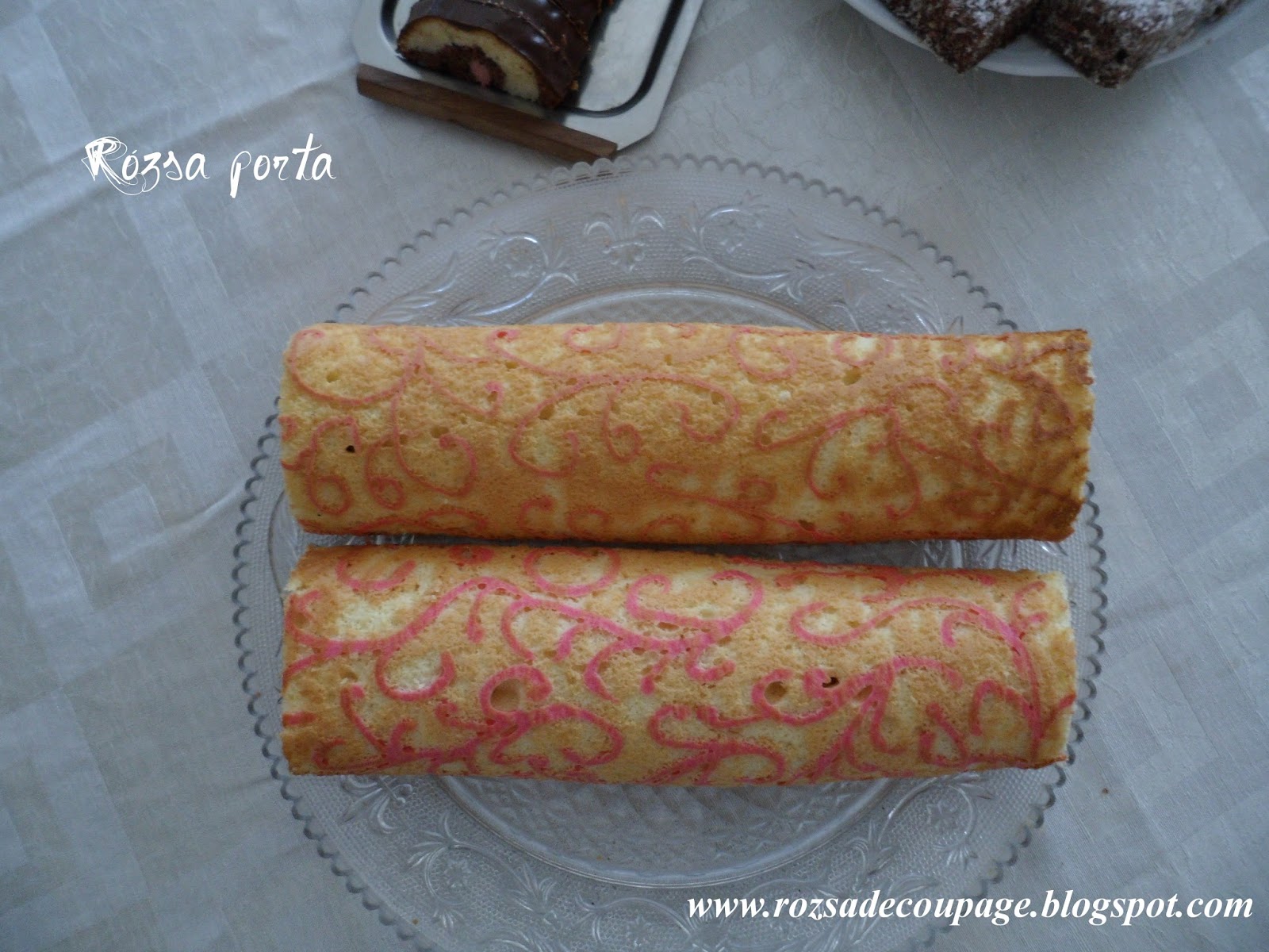 Amit erről a napról hoztam annak ugyan semmi köze a decoupage-hoz, de azért mégis. Mert többféle sütit sütöttem, de ez a piskótatekercs azért azt kell mondjam nem az a szokványos és erős bizonyítéka annak, hogy még sütés közben is lehet kicsit a decoupage-technikákat mélyíteni. Ezen a sütin például az úgynevezett "cirkalmazást". Mert erre ugye ott is szükség van, s hogy üvegkontúrral vagy éppen sütitésztával gyakorolunk-e az teljesen mindegy, a lényeg, hogy gyakoroljunk.