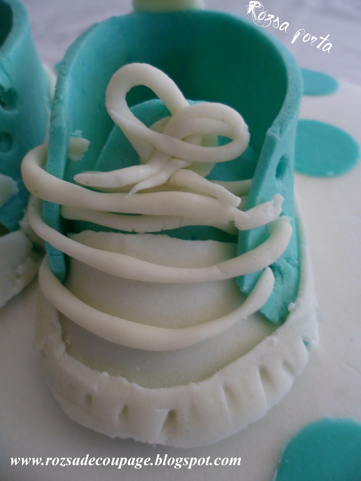 Erre az alkalomra is készültem sütivel, egy keresztelő-tortával. Ez azért lényegesen hosszabb művelet volt a fenti piskótánál, de a végeredmény szép is lett és finom is. Jó, jó, cukrász nem vagyok, nem esek ám hanyatt magamtól, tudom, hogy egy profinak ezek a kis cipőcskék sokkal jobban sikerülnek, de azért elégedett voltam a végeredménnyel, még akkor is, ha a cipellők kicsit megtörtek lettek menet közben. De a miénk volt, finom volt és mindenkinek tetszett. Gábor csak fényképről fog rá emlékezni, tudom, de sok-sok év múlva szerintem az is jó lesz.