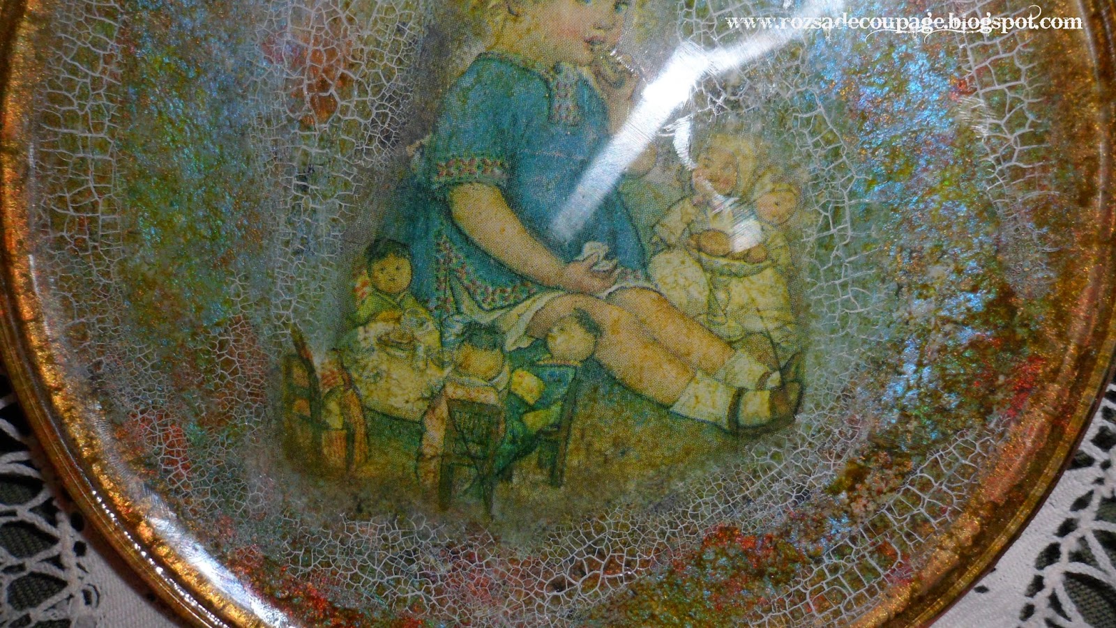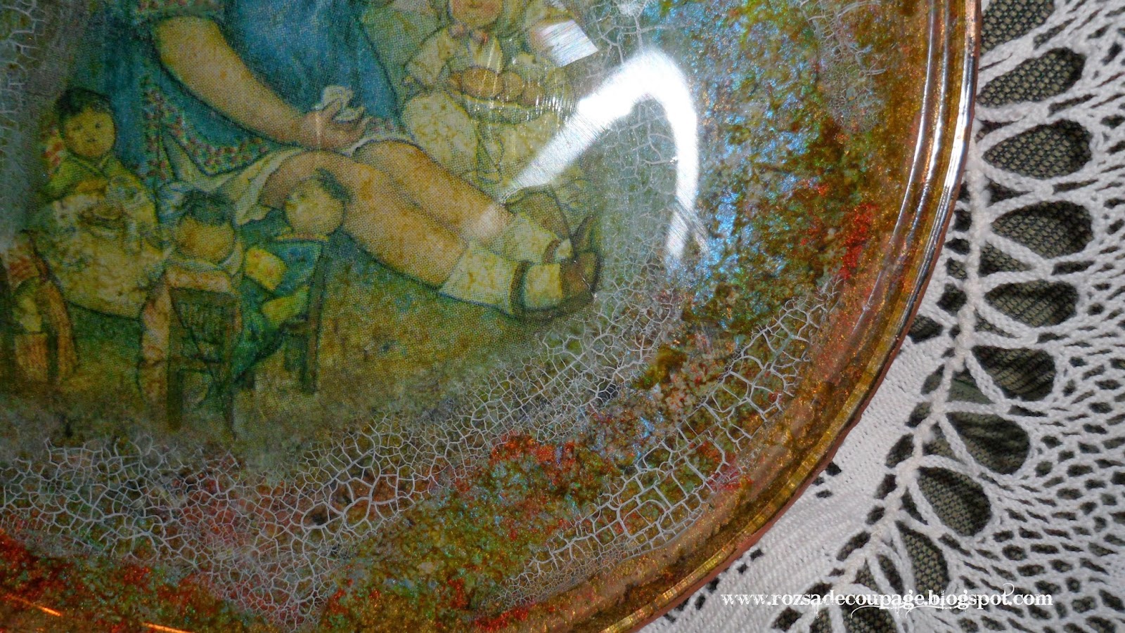 Elkezdtem ezt az üvegtálat, a tál hátulján dolgoztam, s odáig, hogy feltettem a képet és körbe megcsináltam a repesztést és az antikolást egészen szaporán haladtam, de aztán megtorpantam: hogyan tovább. Érdekes is legyen és szép is - elvégre az egész ív rizspapírt emiatt az egyetlen kislány miatt vettem meg, szinte csak ez tetszett rajta, de ez nagyon -. Amikor matattam a festékek között ismét rám köszöntek ezek az Esprimo-s tubusok. Mivel nem írtunk már kora estét - inkább éjszakát -, gondoltam alszom még rá egyet, de úgy tűnt másnap, hogy nem aludtam ki magamból a kíváncsiságot, s szerintem jól tettem. Nekem kifejezetten tetszik a végeredmény.