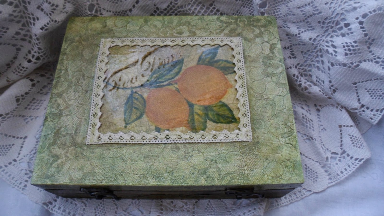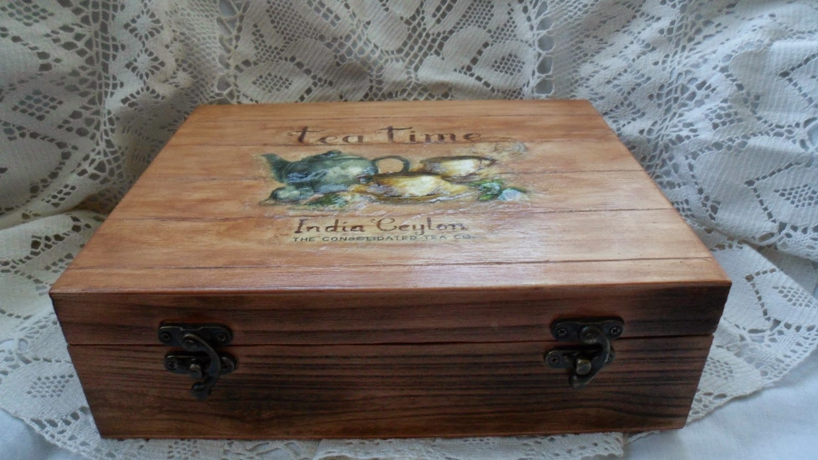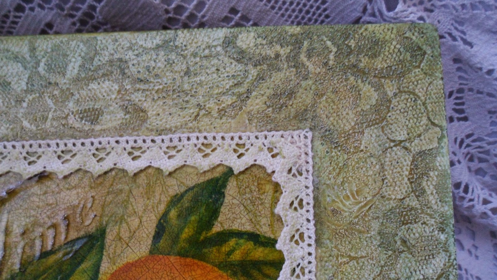 A zöldes - nos ahhoz nem igen kell komment, a mostanában nálam annyira szeretett csipketechnika, most éppen így, a barna talán inkább szót érdemel, mert a képen nem igen jön át, de a minta rajta 3D-s, a teáskanna, a csészék és egyebek alatt egy paszta lapul, amitől domborúak a "tárgyak" rajta. Mivel a képanyag kicsit rusztikus, próbáltam ráhangolni a hátteret, amolyan "deszka-immitáció" lett belőle.